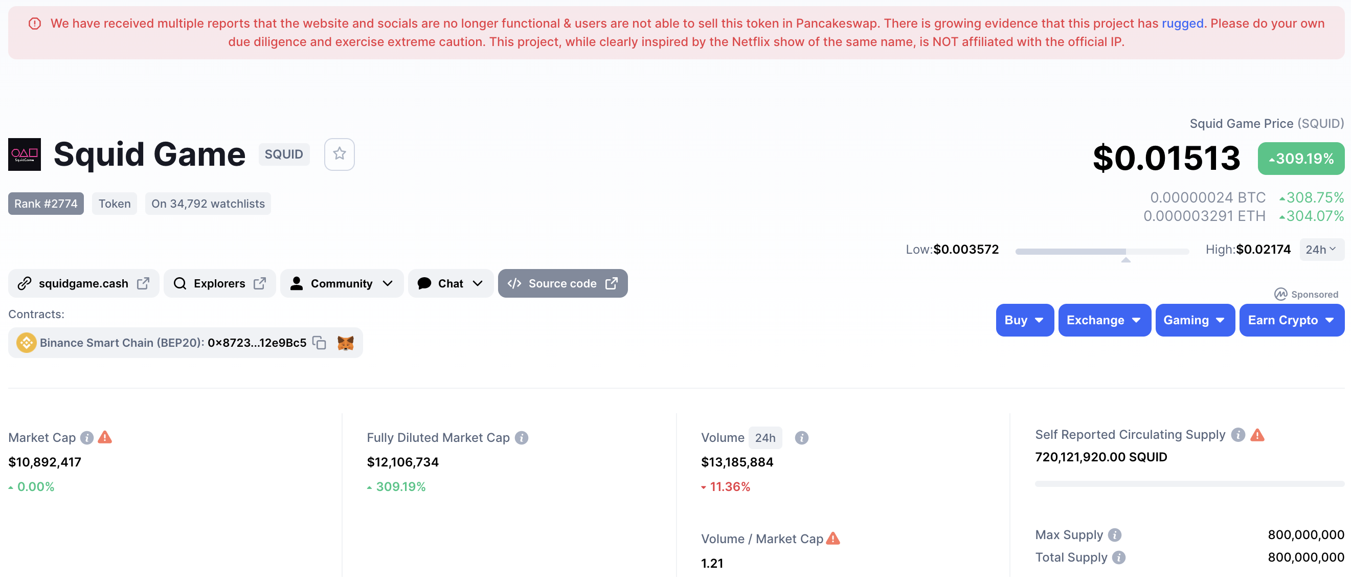 Squid Game token is a meme token, it became popular and popped briefly making people think it’s a real deal. Sadly, a lot of people were scammed when Squid Game developers listed their Squid token on platforms, collected money, and ran off with investors’ money.
